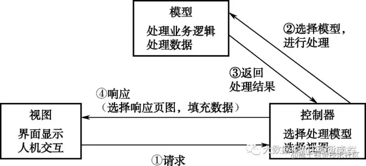 MVC模式的流程如下:浏览器通过视图向控制器发出请求,控制器接收到请求之后通过选择模型进行处理,处理完请求以后再转发到视图,进行视图界面的渲染并做出最终响应,如图所示。