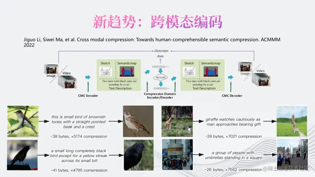 图上这个工作是由北大马思伟老师团队去年完成的。这项工作的主要目标是在对一幅图像进行压缩时,能够直接提取出其中的文字。当然,将描述传输过去并重新生成图像时,可能会有一些细节的损失,导致生成的图像与原图不完全一样。因此,为了保持图像的结构性,这项工作引入了 Sketch 和 Semantic map 的概念,用于引导图像的生成。此外,生成图像的能力本身也是一个重要的工程问题,因为在生成过程中需要尽可能地恢复原图的特征。从跨模态的角度来看,这个工作是有意义的。但是也许可以更直接一些,将这些信息从统一的大模型中提取出来,而不需要进行手工设计特征。