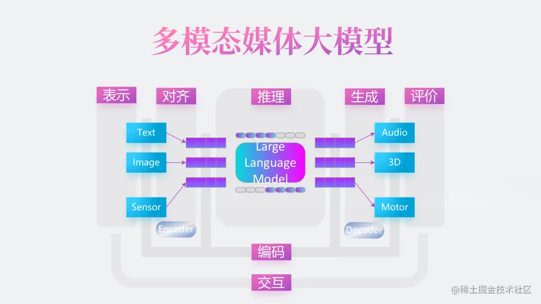 生成(Generation):多模态媒体大模型也可以用于生成新的多模态数据。例如,可以通过给定一段文本描述来生成对应的图像或视频,或者通过给定一段音频生成对应的文本。我们可以对推理输出的中间表示进行解码,输出需要的模态。