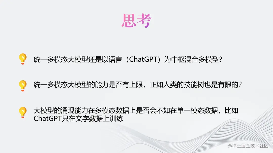 首先,关于多模态,目前我们主要以 GPT 为中心,但这是否是最佳方式?是否还有其他路径或方法?这个问题还没有清晰的答案。