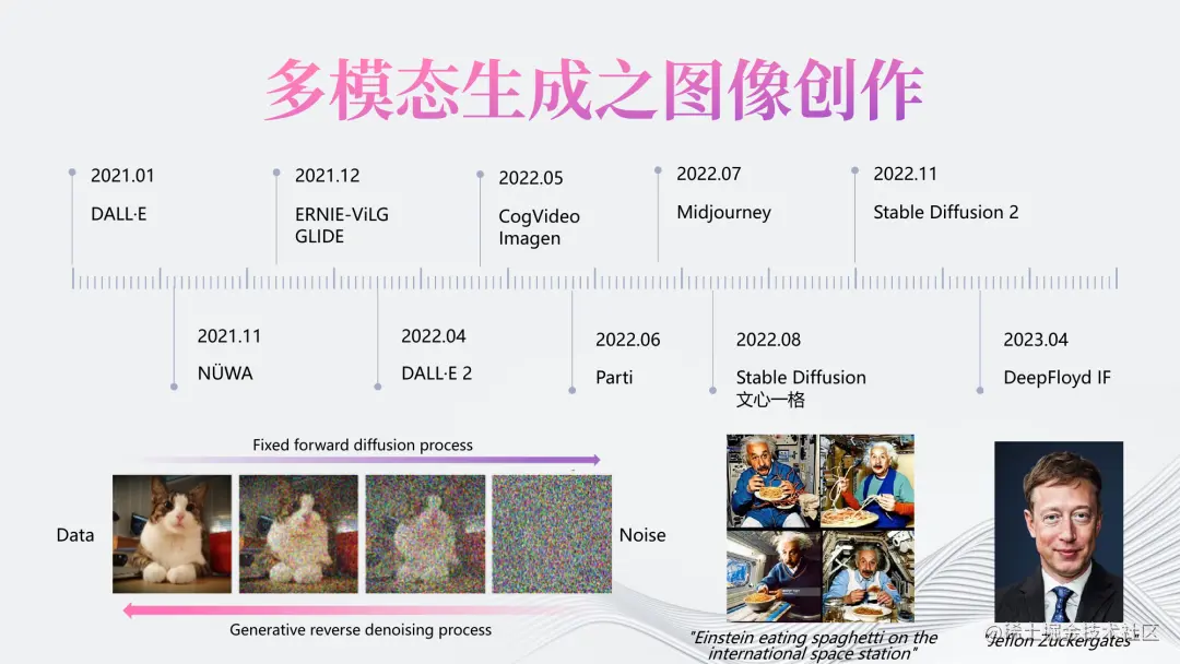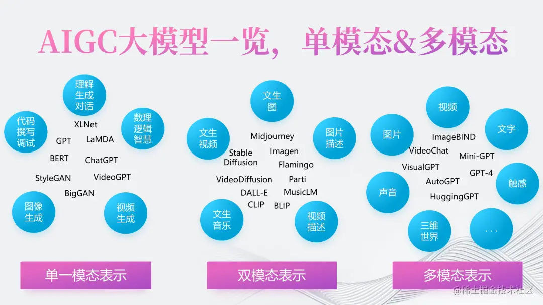 从 AIGC 和模态的角度来看,我们可以观察到模型的发展呈现出三个阶段。最初阶段是单模态模型,像 GPT 这样的模型在这个阶段起到了代表性的作用。