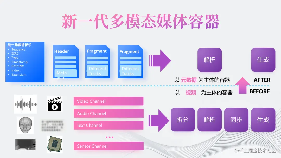 此外,容器也会有重大变化,多媒体数据的标识解析将起到更大的作用。我们现在使用的诸如 HLS 等技术,不同模态在不同的通道保存。在未来,容器中的数据可能只是一些源数据、控制指令和脚本。这种新的视频内容会与游戏领域的一些技术相结合,如果大家关注游戏的话,肯定知道 Meta 正在推动的开放 USD 格式。这个文件很可能为我们提供一个机会,将这种新型视频内容与文件容器进行融合。容器中可以包含脚本,这些脚本可以驱动、运行,也可以通过 prompt 生成或替换。这才能真正实现交互时代的内容。以前这些东西都是流媒体思维的产物,流媒体的思路并没有改变过。但如果要变成交互类型的内容,所有这些东西都需要重构。