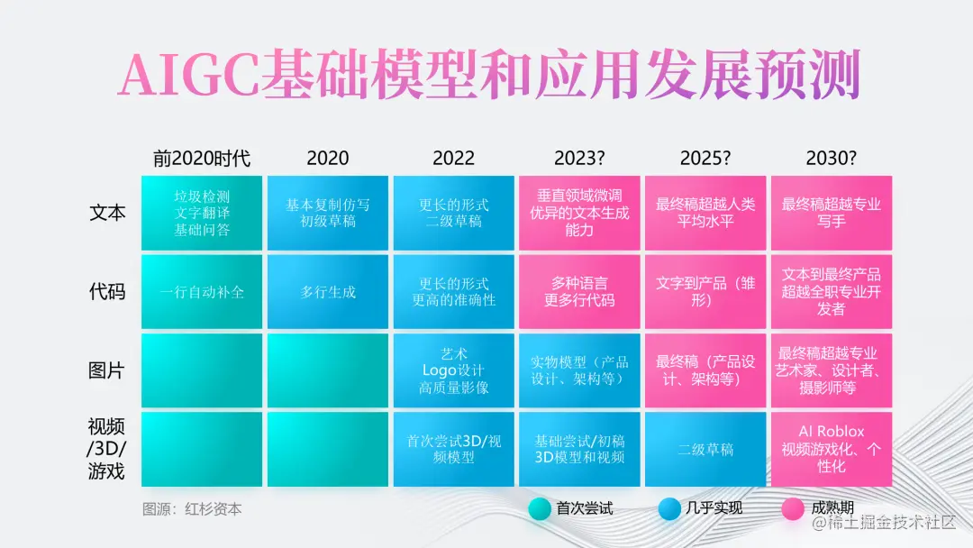 红杉资本的这张图展示了 AIGC 基础模型的发展态势,目前普遍认为我们处于发展的中间阶段,后面的预期都打着问号,表示未来的发展路径可能存在不确定性,时间上可能会更快或更慢。有些事情可能比我们想象的简单,有些则可能更复杂。然而,我个人认为,各大头部公司和创业企业已经涌入这个领域,投入了大量的智力和资源,这将加速发展进程。