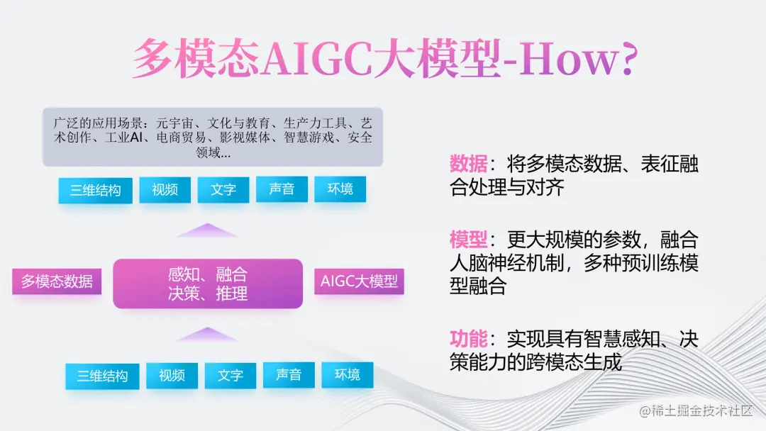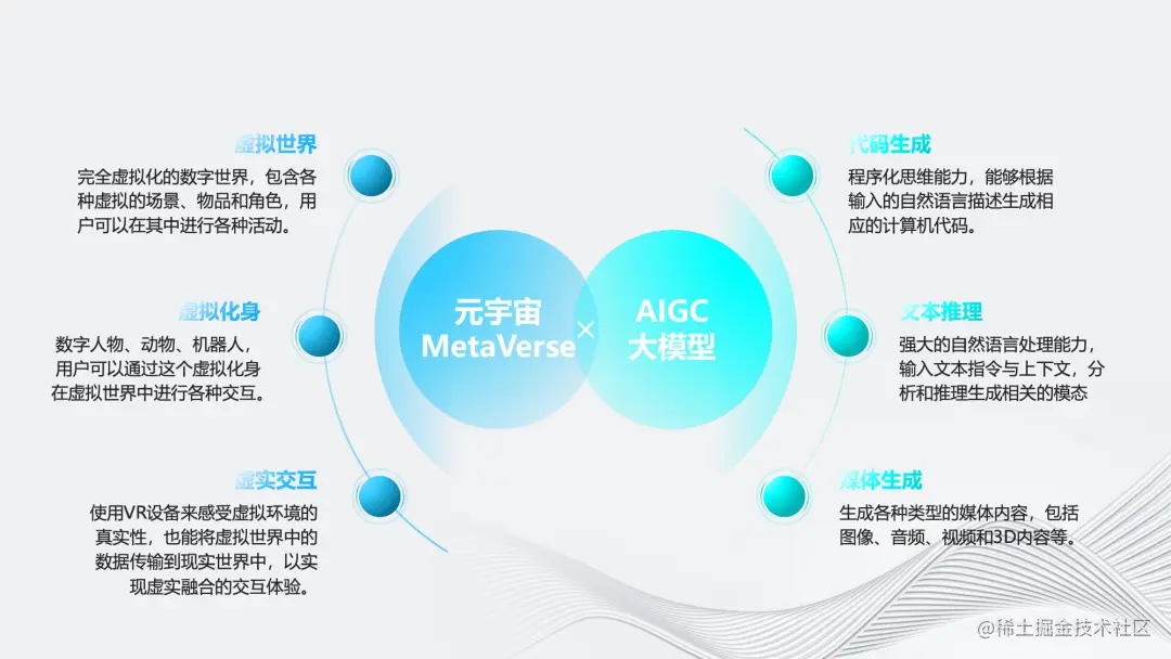 对于内容生成的讨论上,去年元宇宙的话题备受关注,今年则是大模型抢了风头。但实际上,AIGC 将大模型与元宇宙之间建立了一个很好的桥梁。当我们强调元宇宙时,更注重的是用户体验和带入人类的因素。而大模型则更注重于工具和赋能。这两个方面应该是相互补充的,形成一个整体,既包括生产力也包括用户体验。