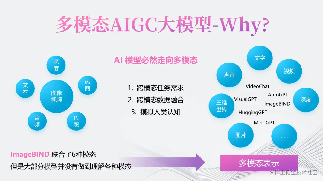 最后,从研究和学术角度来看。人类认知本身就是天然的多模态过程。如果我们人工智能的大模型要去逼近人类智能的话,尤其是从感知到认知的角度,走向多模态是符合自然规律的。代表性的例子之一是 Meta 的 "image-bind",它融合了六种模态,并且是开源的,取得了一定的效果。虽然跳出给定的数据集进行评估时可能并不理想,但至少他们为这个领域开辟了一条道路。