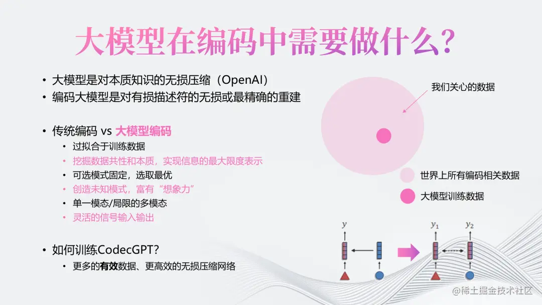 这个编码器中的许多描述信息需要以描述符的形式进行编辑。这些描述信息可能包含人类可理解或不可理解的内容,但更像是元数据。在此基础上,大模型也可以是一个增强模型,可以进行预处理和后处理。统一编码器 Codec GPT,再加上 Diffusion 的后处理,可以作为一个完整的数据表示。