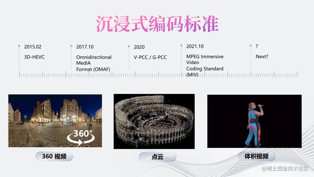 MPEG 在 2021 年底启动了 MIV(Moving Immersive Video)项目,并在去年底发布,主要关注的是对体积视频的编码。MPEG 下一步开始关注类似 AIGC 或NeRF(Neural Radiance Fields)这种神经表达技术,这个领域正处于一个新旧转换的时期。内容的未来发展将肯定是朝向真正的 3D 表达,而如何进行 3D 表达的压缩是一个重要的课题。