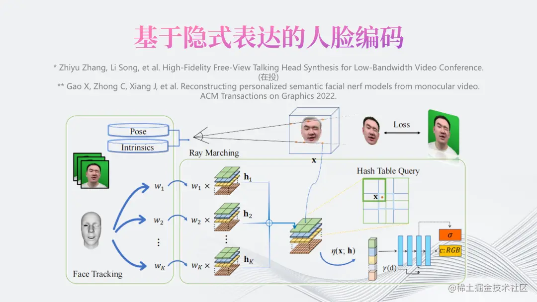 隐式表达还具有一个优点,就是生成的图像合成是自然的。与传统的贴图不同,隐式表达能够自带光照属性和视角变化,其渲染效果更加自然。从渲染的角度来看,NeRF方法比 MIV 的效果更好,甚至比 VVC 的效果更好一些。至于隐式表达在人脸合成上的应用,NeRF 也有更好的效果。