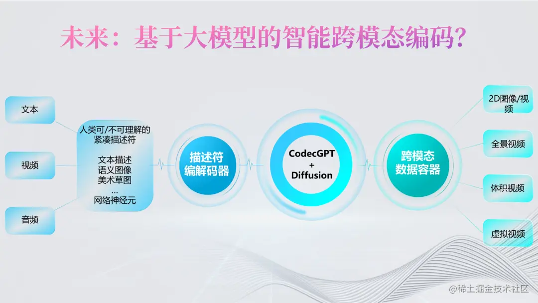 在解码时,只需要根据需求提取所需要的模态,不再需要每个模态单独的容器。如果只需要视频,那么可以仅提取视频部分,或者可以提取其投影版本。如果想看 3D 内容,那么可以提取 3D 投影。此外,结合之前提到的云边端结合,这种模型可以部署在边缘设备上,用户可以与之交互并获得所需内容。这有可能变成一种新的数据交互形态。