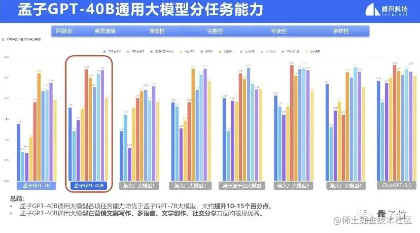 数据显示,孟子 GPT-40B 版本全面领先 7B 版本,大约提升 10-15 个百分点。