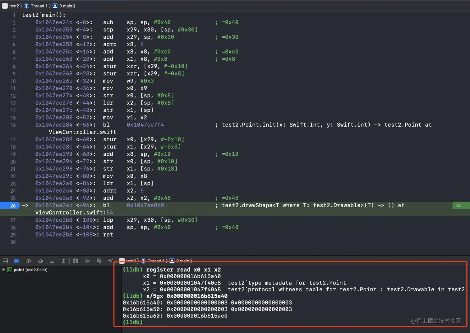 这里我们只要关注bl这个函数调整指令,但是这里有好几个bl相关的指令,但是运行时多态肯定不是跳转写死的地址,所以我们只需关注blr x10的指令。然后我们打印一下当前上下文使用到的寄存器的信息,发现x8存放的是一个 protocol witness table for Point的东西,而x10是通过x8+offset获取了protocol witness for Drawable.draw() -> () in conformance Point的函数地址,最终通过blr x10的指令跳转并执行。