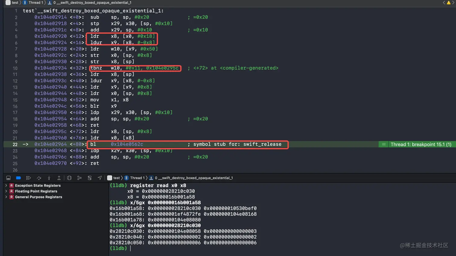 首先看到x0存放了Existential Container的地址,x1是MetaData的地址,通过MetaData地址加偏移找到了FullMetaData地址,最终找到VWT地址。从VWT地址加偏移找到了flag的值(就是上面说到决定ValueBuffer存储方式的flag),最后比较第0x11位是否为0知道了对象是直接存放在ValueBuffer上,所以Existential Container的地址就是对象地址,就直接返回了x0。