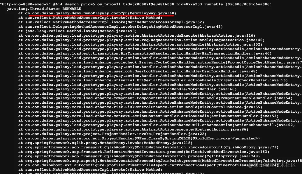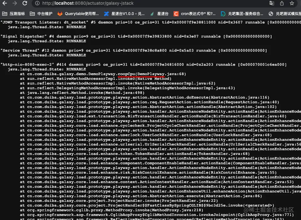 2:访问/coopCpu.do接口,观察cpu飙升。通过/actuator/galaxy-jstack接口查看线程栈。得到如下线程栈
