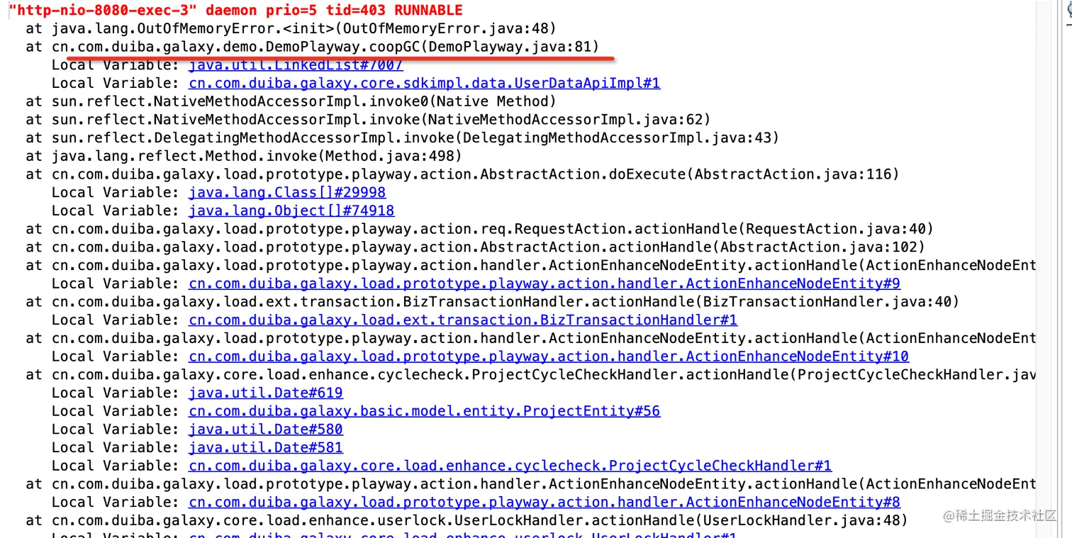 5.若步骤3无法打开或者步骤4找到的是gc线程,就需要通过判断是否是gc问题。(这里注意活动代码不要捕获throwable级别的抛出,否则框架无法捕获内存溢出的错误。)