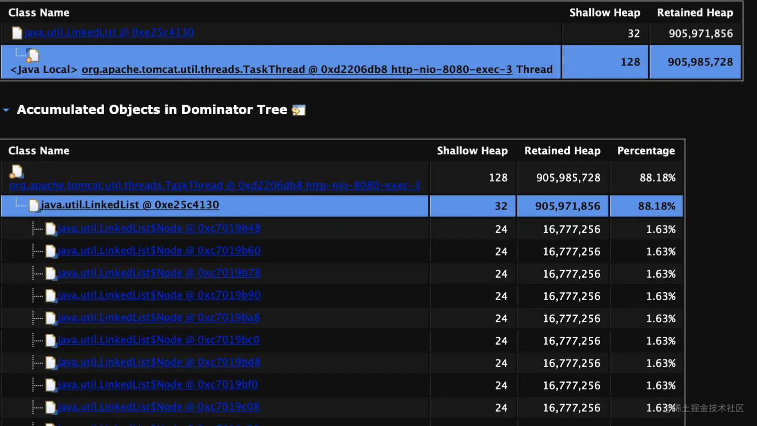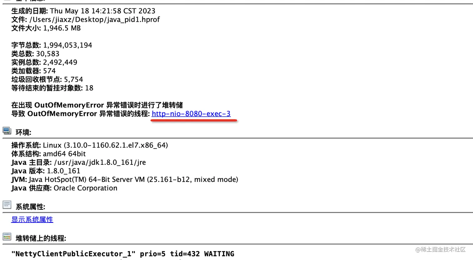 2:通过MAT打开dump文件,通过查看内存泄漏文档详情,得到如下图
