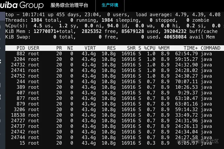 4.若上述操作失败,登上容器,先下载线程栈文件,并查看对应进程的线程的cpu使用量,找到最大的线程,将线程id转成十六进制后在线程栈中找到对应的活动并下架。