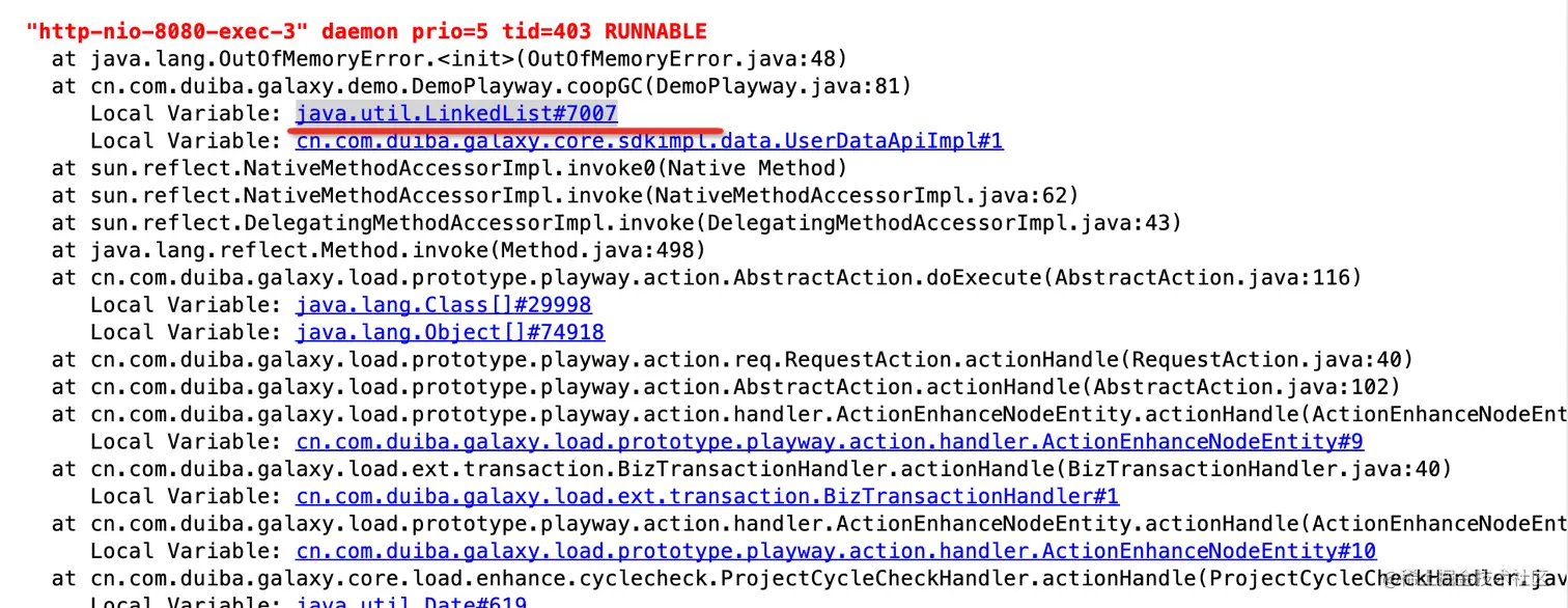 3:该排查场景只针对问题代码不停产生新对象的场景。若问题代码持有大对象不释放,且其他线程正常产生对象造成的内存溢出不适合该排查思路。