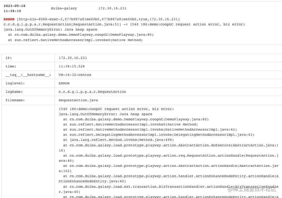 2:访问/coopGC.do接口,查看现象。发现系统迅速恢复正常,且日志展示了内存溢出以及对应活动代码