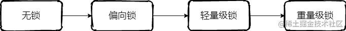 在JDK1.6中,为了减少获得锁和释放锁带来的性能消耗,引入了偏向锁和轻量级锁,锁的状态变成了四种,如下图所示。锁的状态会随着竞争激烈逐渐升级,但通常情况下,锁的状态只能升级不能降级。这种只能升级不能降级的策略是为了提高获得锁和释放锁的效率。