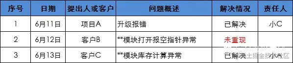 一般跟踪发布后三个月的情况,为了便于统计可以使用在线文档或禅道、JIRA等项目管理平台,建立统一汇总跟踪任务单。
