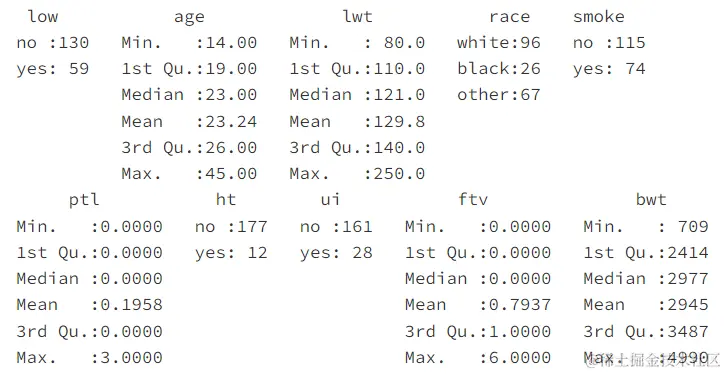 函数 summary( )可以对每个变量进行汇总统计。对于数值型变量,如 age、lwt、plt、ftv 和 bwt,函数 summary( )给出最小值、下四分位数、中位数、均值、上四分位数和最大值;对于分类变量,如 low、race、smoke、ht 和 ui,给出的则是频数统计表。