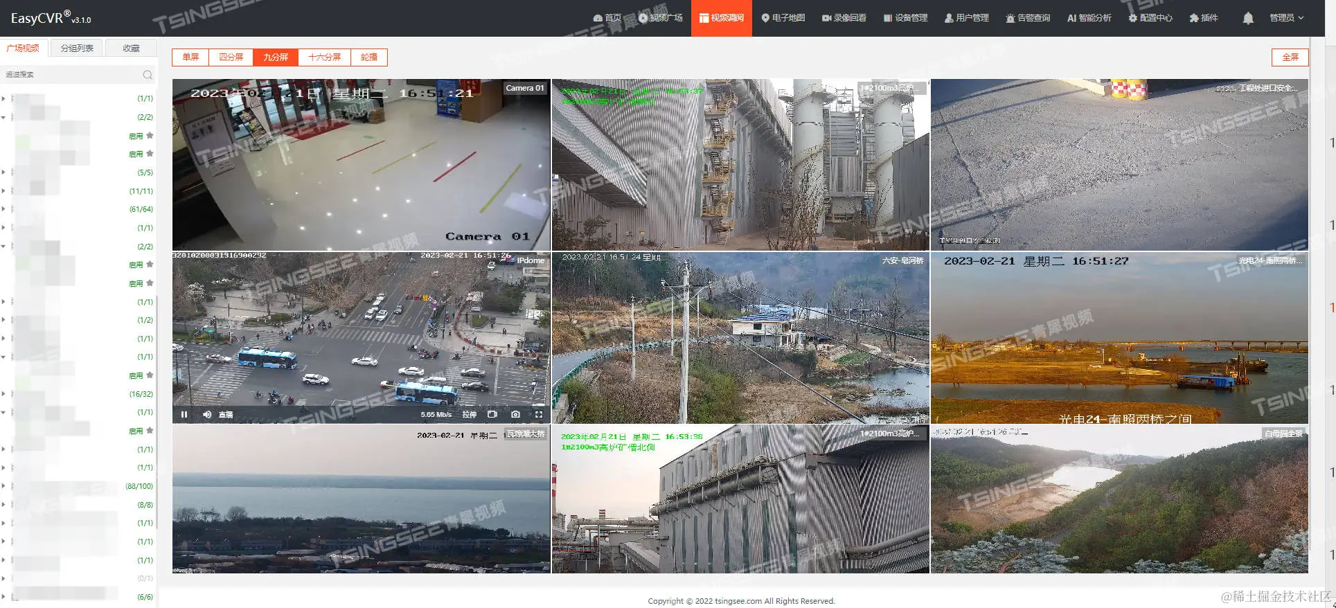 安防监控/视频汇聚平台EasyCVR还可将各管制区域内部署的摄像头快速、便捷地接入,实现分散视频监控资源的统一汇聚与集中管理,并采用设备树进行分组、分级管理、角色与权限配置等,达到统一、集中、高效监管的目的。视频联网平台EasyCVR支持多协议方式接入(国标GB/T28181、RTMP、RTSP/Onvif协议,海康Ehome、海康SDK、大华SDK、宇视SDK、华为SDK、萤石SDK、乐橙SDK等)、支持单画面、多画面显示,可选择任意一路或多路视频观看,视频窗口数量1、4、9、16个可选,支持视频上墙、电子大屏、拼接大屏等多终端显示,还支持视频轮巡播放,提高监管效率。