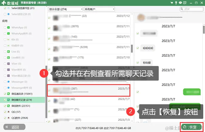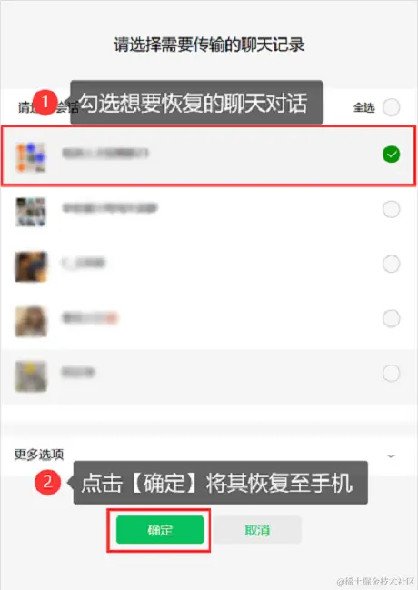 步骤2:勾选想要恢复的聊天对话,然后点击下方的【确认】即可将聊天记录恢复到手机进行查看。