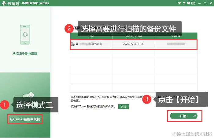 步骤2:手动选择第二种模式【从iTunes备份中恢复】,选择近期备份的文件然后点击【开始】等待软件提取iTunes备份数据。