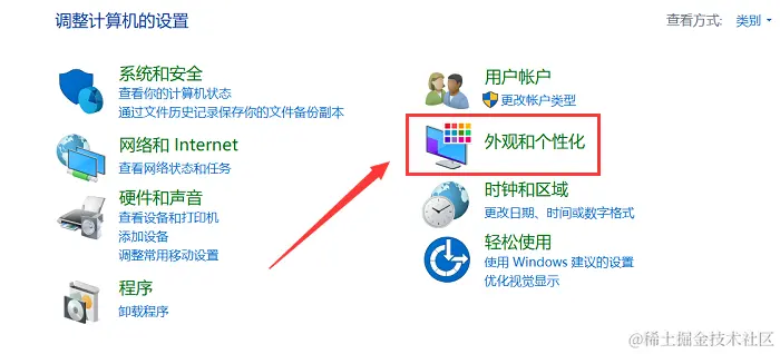 步骤3:在控制面板窗口中,点击 【外观和个性化】 ;