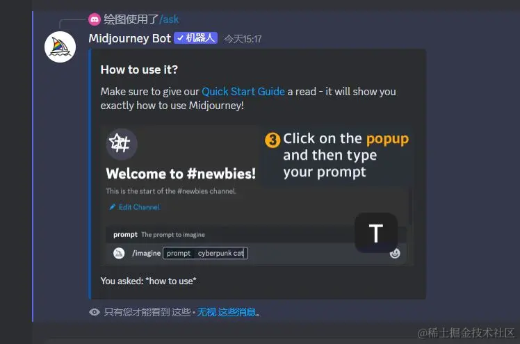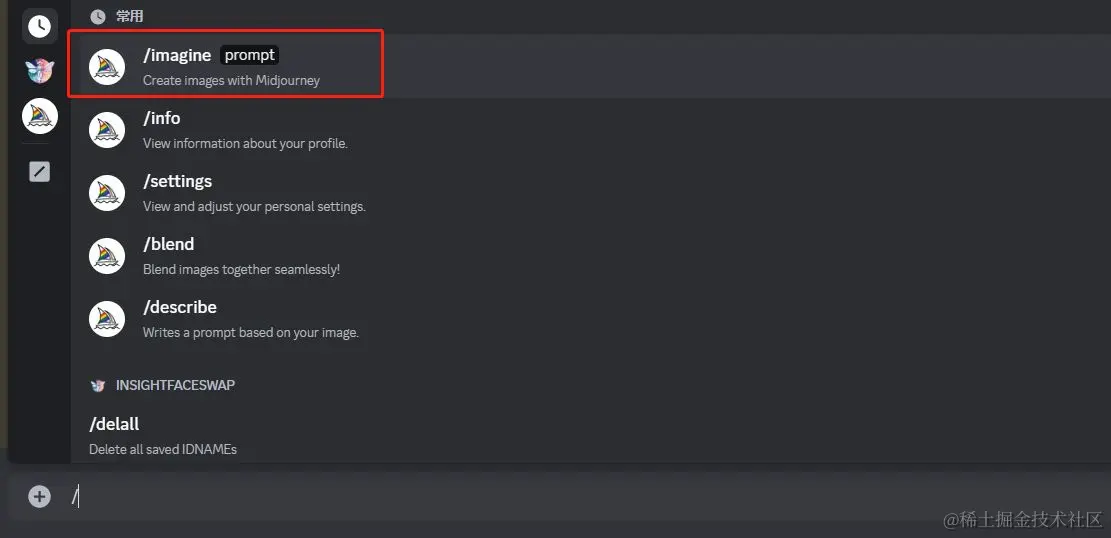 在服务器下方的输入框输入"/",会弹出一系列的指令,这个指令就是生图的命令,输入一些关键字发送