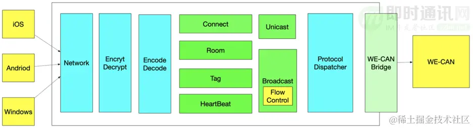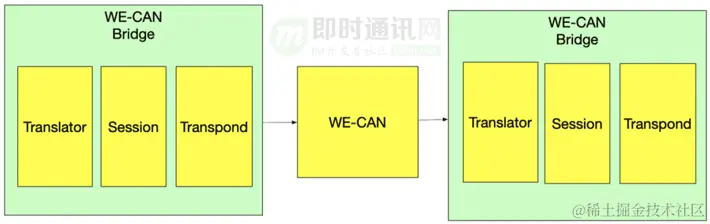 为了适配 WE-CAN 大网,我们设计了 WE-CAN Bridge 层,作为大网接入协议和聊天室协议的桥接层,负责协议转换、会话管理、转发接收。通过这种分层架构,接入层和后端业务层可以少修改或者不修改,减少对已有系统的改造成本,也降低了架构升级带来的风险。