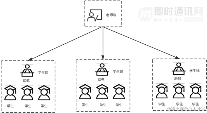 **如上图,展示了超级小班课的一个场景:**1 个主讲教师+ N 个互动小班+ N 个助教,所有学生被划分成了一个一个的小班,由对应的助教完成预习提醒、课后答疑、作业监督、学员学习情况反馈等工作,同时又接收来自主讲老师的直播画面,做到了大课的规模,小课的效果。