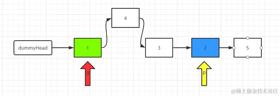- 我们定义两个指针,分别称之为 g 和 p 。 我们首先将 g 移动到第一个要反转的节点的前面,将 p 移动到第一个要反转的节点的位置上。