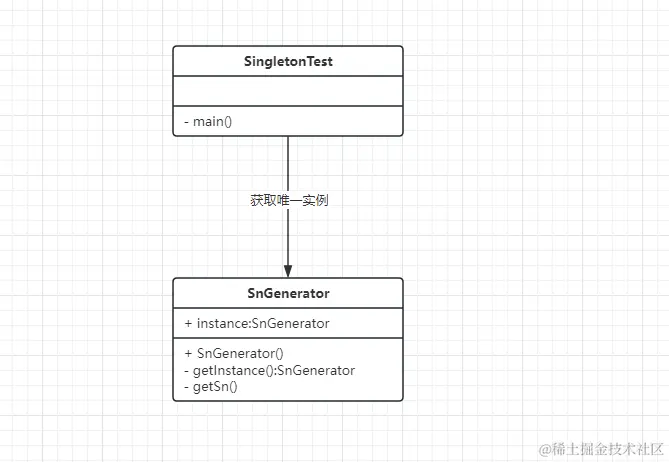 以上首先创建一个单例类,提供唯一的单例获取方法 getInstance。SingletonTest 类通过 Singleton.getInstance 获取实例,获取到实例,也就获取到实例所有的方法。示例中调用 getSn 方法,获取到唯一的订单号了。