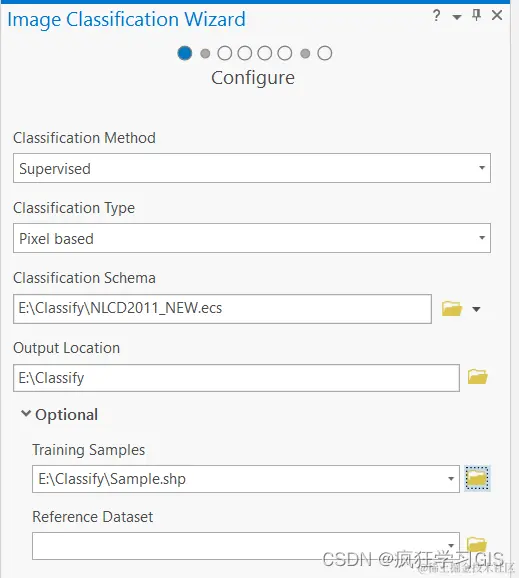 随后,在弹出的窗口中,配置我们需要的遥感影像分类参数即可。如下图所示,第一个选项表示我们将使用监督分类、非监督分类等不同的分类方式;第二个选项,则表示我们将以像元为分类的目标,还是以一个对象(其实就是像元加上他周围的其他邻域像元)作为分类的目标;第三个选项,我们通过如下图所示的第一个下拉菜单选项,找到我们前述步骤中,保存好的Schema文件;第四个选项,就是分类结果的输出路径。