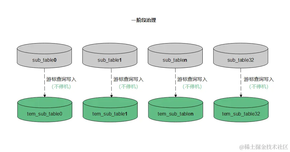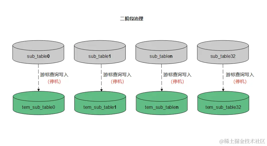在一阶段治理结束之后的某一个时机停机,去做一阶段治理时间点 到 此次停机前 原表增量数据的治理。