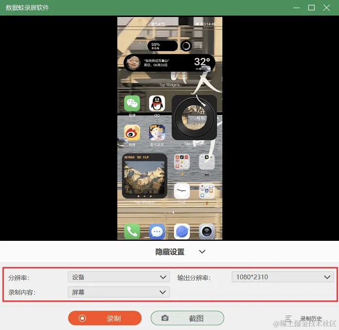 步骤3:投屏成功后,在录制之前还可以对分辨率、输出分辨率和录制内容进行调整,点击红色 “录制” 按钮,开始录制屏幕,录制结束后录屏可以保存到指定的位置。