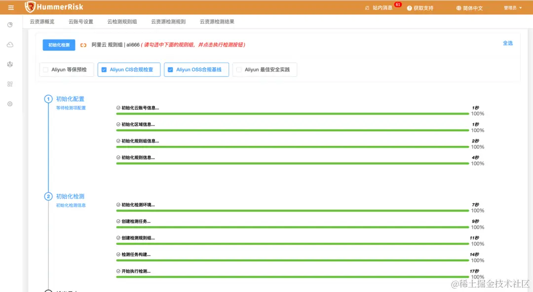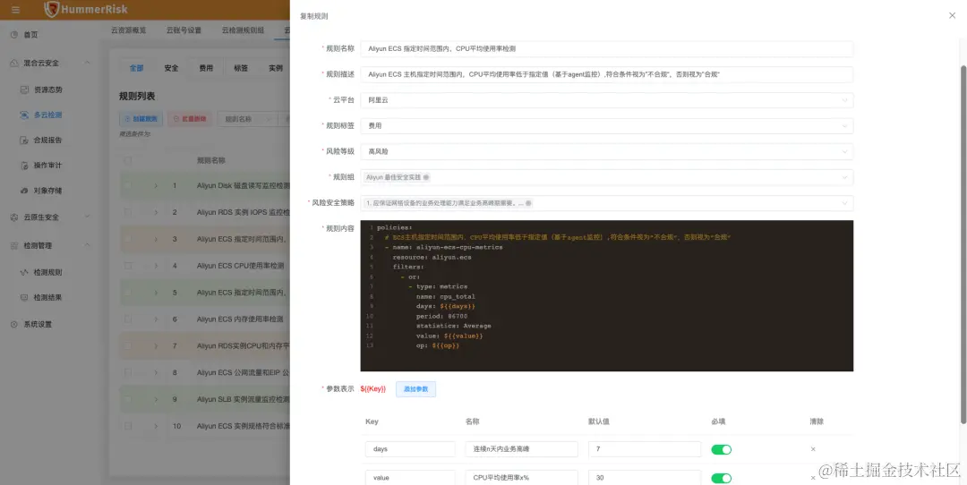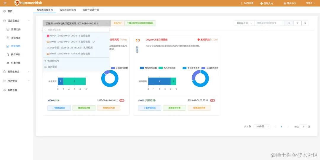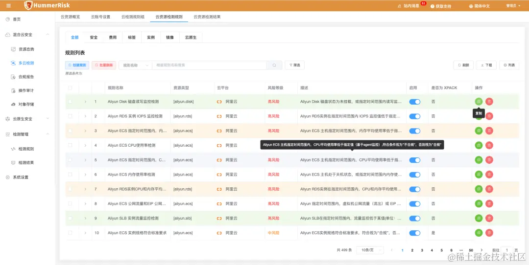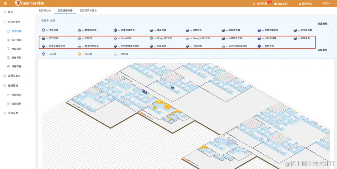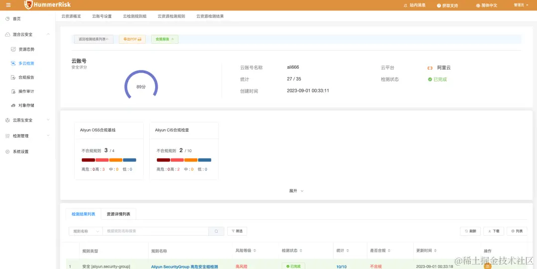 大家好,HummerRisk 1.4.0和大家见面了,在这个版本中我们变更了多云检测的底层逻辑,增加了每次检测的project概念,更好的去支持检测历史和检索需要,增加阿里云最佳实践中资源监控检测规则,增加资源态势中的细化资源图标。并做了多处优化和bug修复。