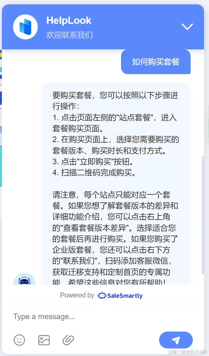 6.在设置完成之后,用户就可以使用Chatbot这个功能来自行解决问题。用户在发送问题之后,HelpLook的Chatbot功能会根据现有资料库的关键词内容自行定位,并且组织成一个合适的答案反馈给用户。