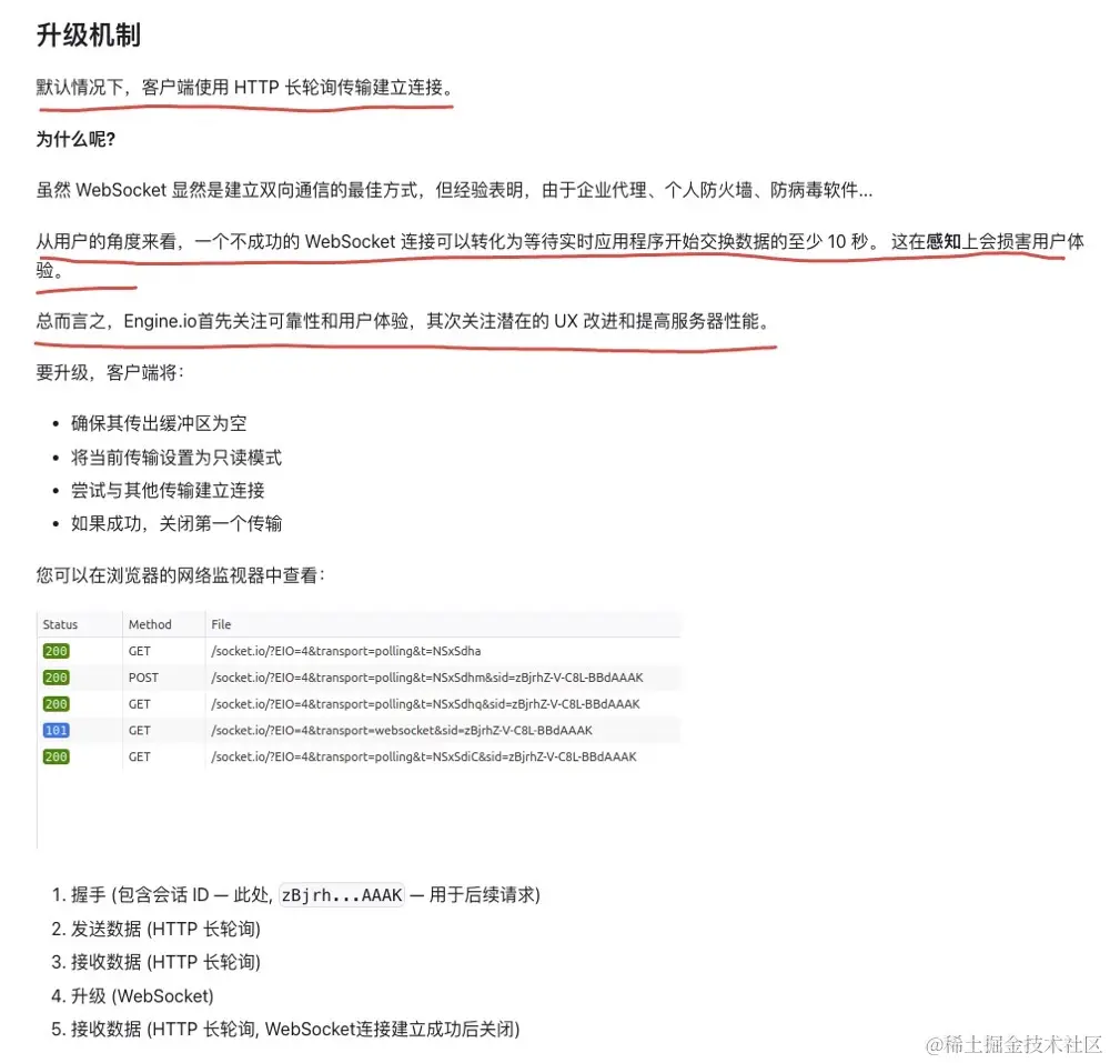 其实考虑下来,我们走的其实不是 socket 的降级,而是默认的升级策略,socket 官网有这样一段描述(官网也提到了 websocket 虽然好用,但是防火墙,杀毒软件都会造成连不上....):