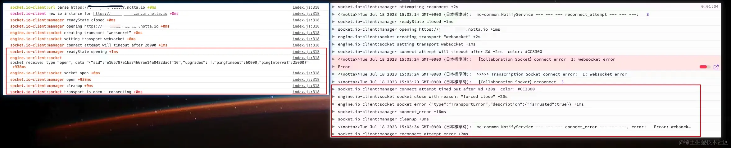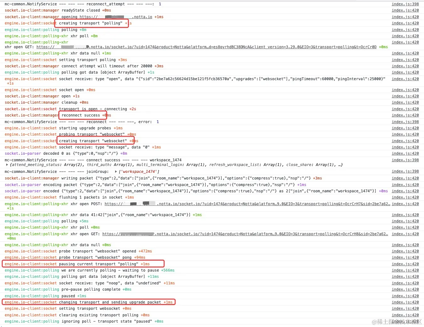 socket.io-client:url parse https://xxx.notta.io与socket.io-client new io instance for ``https://xxx.notta.io这两步,我问了相关同学,他说 logRocket 记录的可能不全,后面补全了日志,但是控制台输出的还是不全,那么这里到底是 logRocket 日志缺失?还是前端少了几个步骤导致连接失败?(后续确认就是 logRocket 日志自己丢了) - 两边日志的共同点在蓝色框区域,可以发现都存在