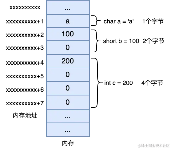 定义变量的时候会在内存中分配内存空间,如char分配一个字节的空间,short分配连续两个字节的空间,int分配连续四个字节的空间。如下: