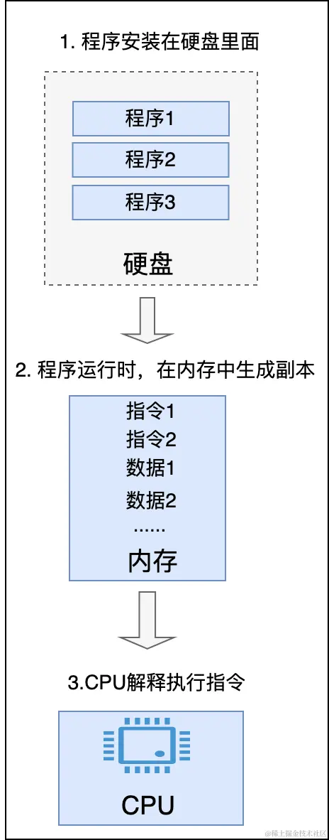 程序运行时,会将硬盘里面的程序复制到内存中。