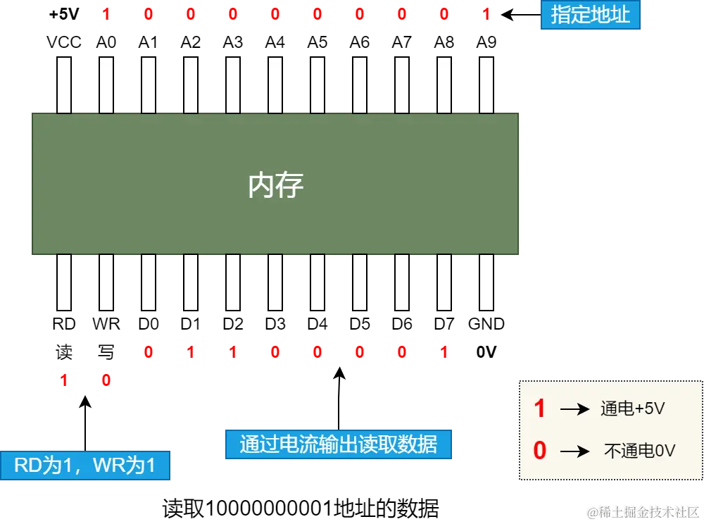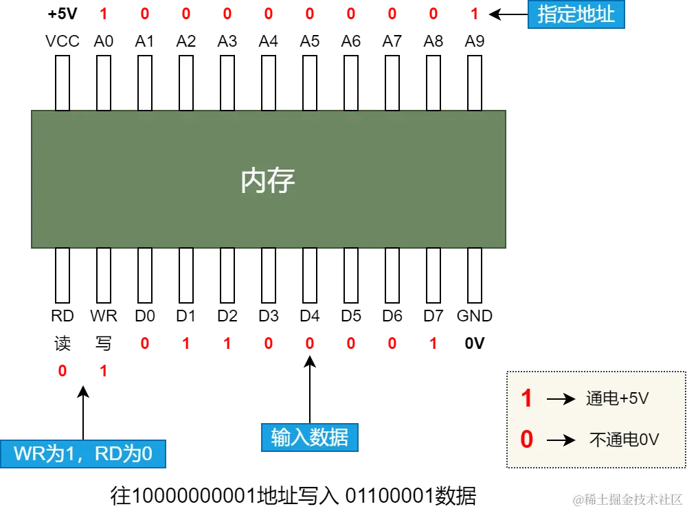内存中有很多引脚,将VCC和GND连接到电源后,就可以通过电流给其它引脚传递0和1信号。+5V直流电压表示1,0V表示0。