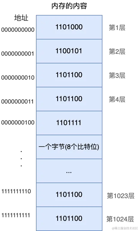 内存为1KB时,如下图所示的有1024层的楼房(这里地址的值是从上往下逐渐变大)。每一层存放一个字节,也就是8个二进制位。
