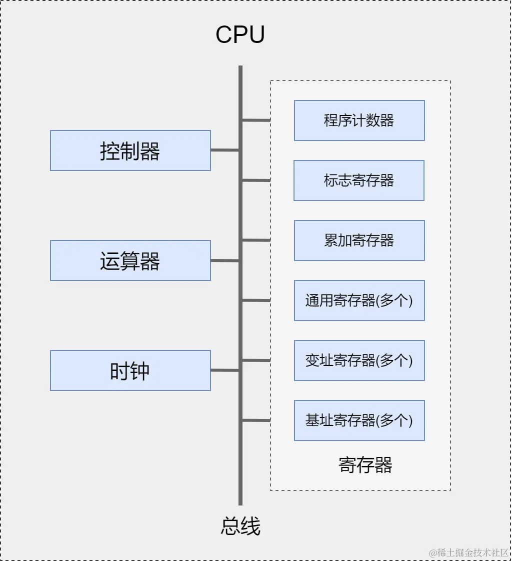 CPU中有多个寄存器(几十个到上百个左右),其中有两个最重要的寄存器,即累加器(Accumulator)和程序计数器(Program Counter)。
