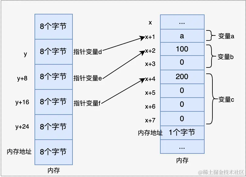 定义指针时,我们通常会在变量名前加一个星号(*)。我们知道,d、e、f 都是用来存储64位(8字节)的地址的变量。然而,为什么这里又用来指定char(1字节)、short(2字节)、int(4字节)这些数据类型呢?大家是不是也感到很奇怪?实际上,这些数据类型表示的是从指针存储的地址中一次能够读写的数据字节数。