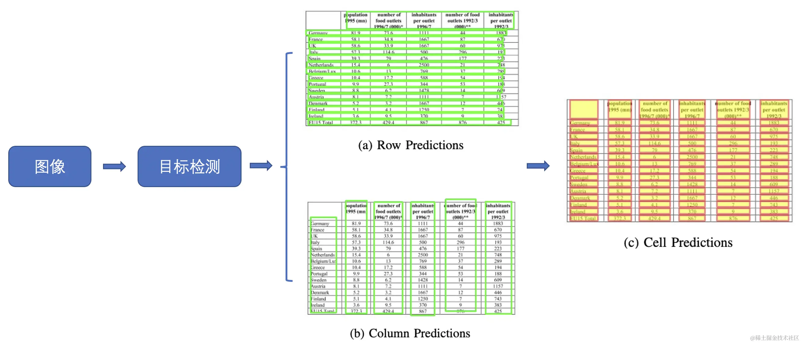基于CNN的方法对跨行列的表格无法很好的处理,因此在后续的方法中,分为了两个研究方法来解决表格中跨行列的问题。