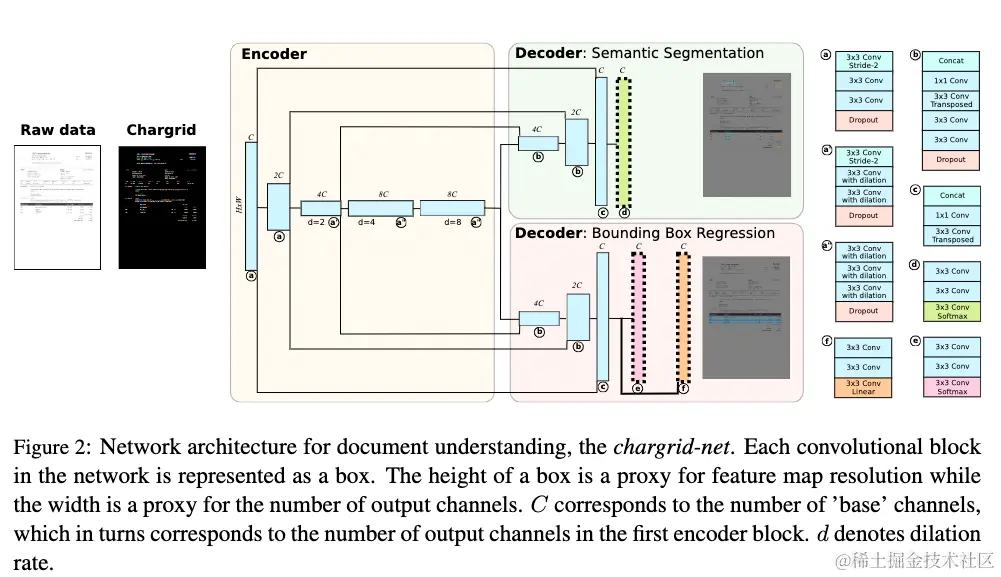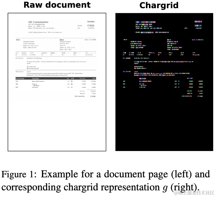 基于Grid的方法在图像层面进行多模态信息的融合。Chargrid[5]首先对图像进行字符级的文字检测和识别,然后通过将类别的one-hot编码填充到对应的字符区域(下图中右图的非黑色部分)内来完成对网络输入的构建,输入最后通过encoder-decoder结构的CNN网络来进行关键信息的坐标检测和类别分类。