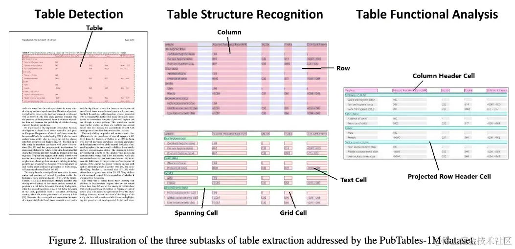 - PubMed Tables(PubTables-1M)[17]:表格结构识别数据集,包含高度详细的结构注释,460,589张pdf图像用于表格检测任务, 947,642张表格图像用于表格识别任务。